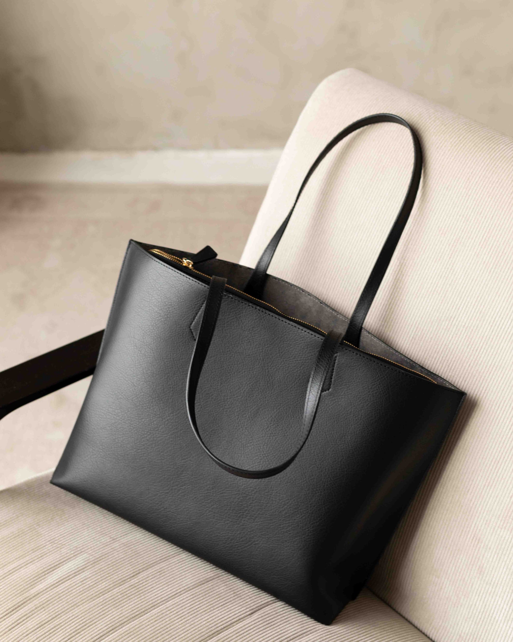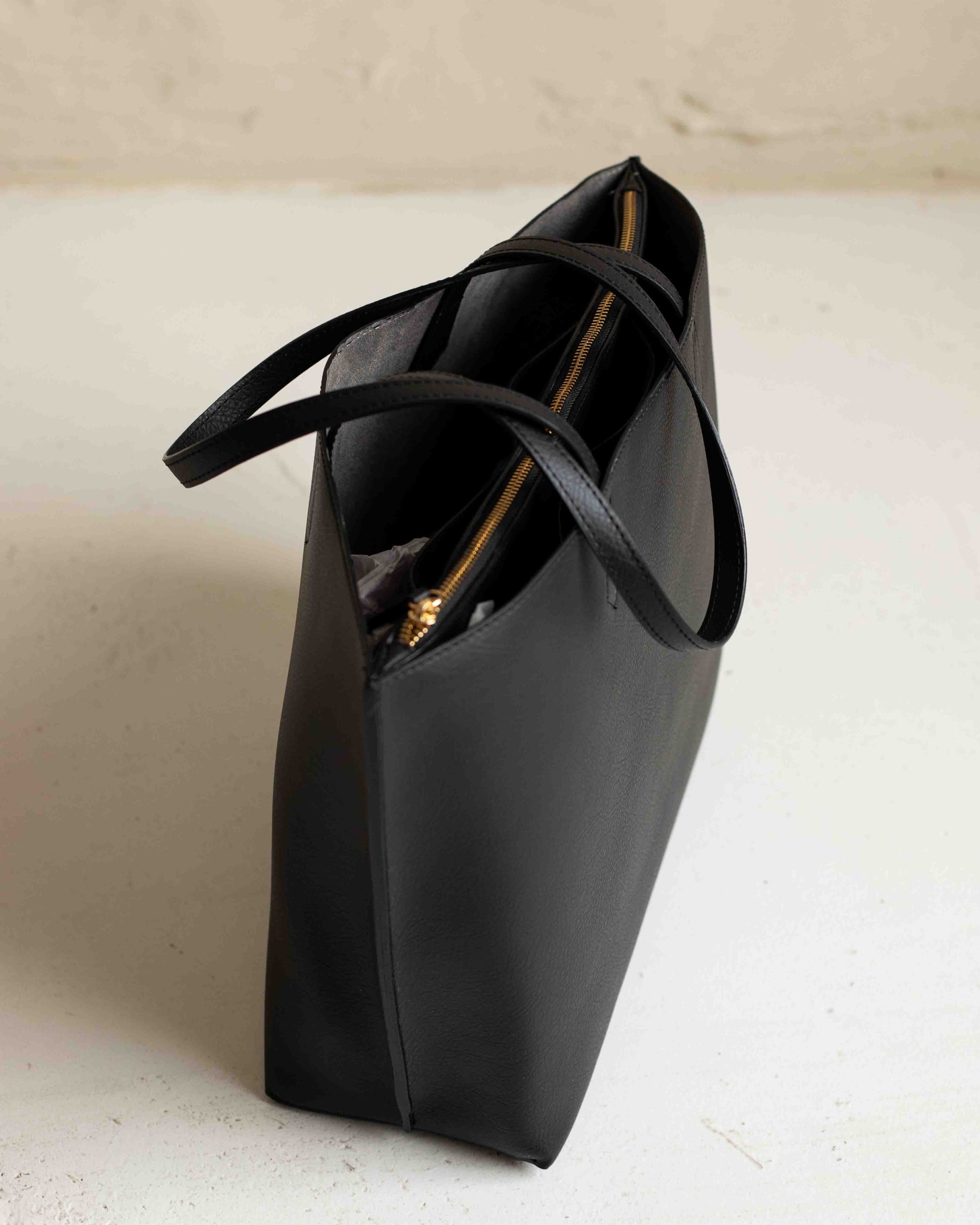 This black vegan leather tote bag is designed for everyday life. Practical, understated, and made to last. Crafted in Italy from high-quality vegan leather, it features clean, minimal lines that make it a reliable piece season after season.
