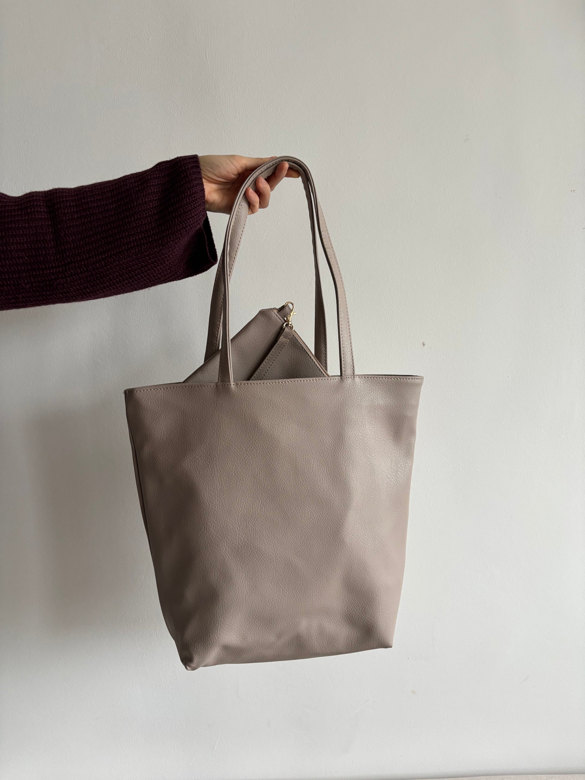 We just came up with our concept of a well known, highly functional, yet minimalist combo bag. IRIS is a large vegan leather tote bag that comes with a medium sized, connectable zipper bag. This way "you hit two birds with one stone". The tote has a huge pocket with a zipper and a bigger, open compartment, with another a smaller, open pocket. The straps of the tote are made with inner linings for extra strength. This way a 14" laptop also fits inside. IRIS really is a classic all rounder piece for everyday use, suitable for work, school and any daily routine. Please ask for more color options.